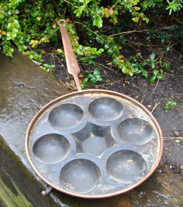 Stor kobber æbleskivepande, 18. årh. Danmark. Stemplet. På tre ben. Dia.: 32,5 cm. L.: 66 cm. Virkelig flot stand!Emne nummer: 20698
