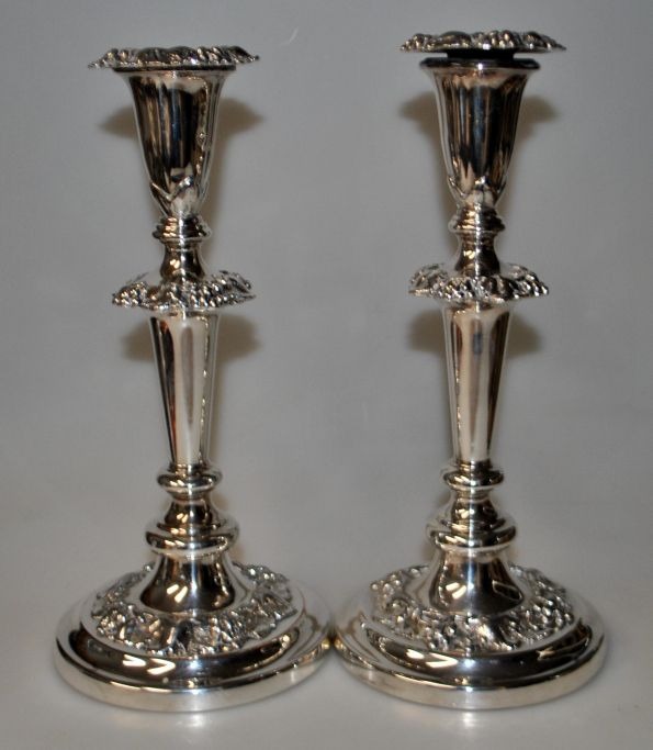 Par forsølvede stager, 19. årh. England. Dekoration med vinløv. H.: 25,4 cm.Flot stand!