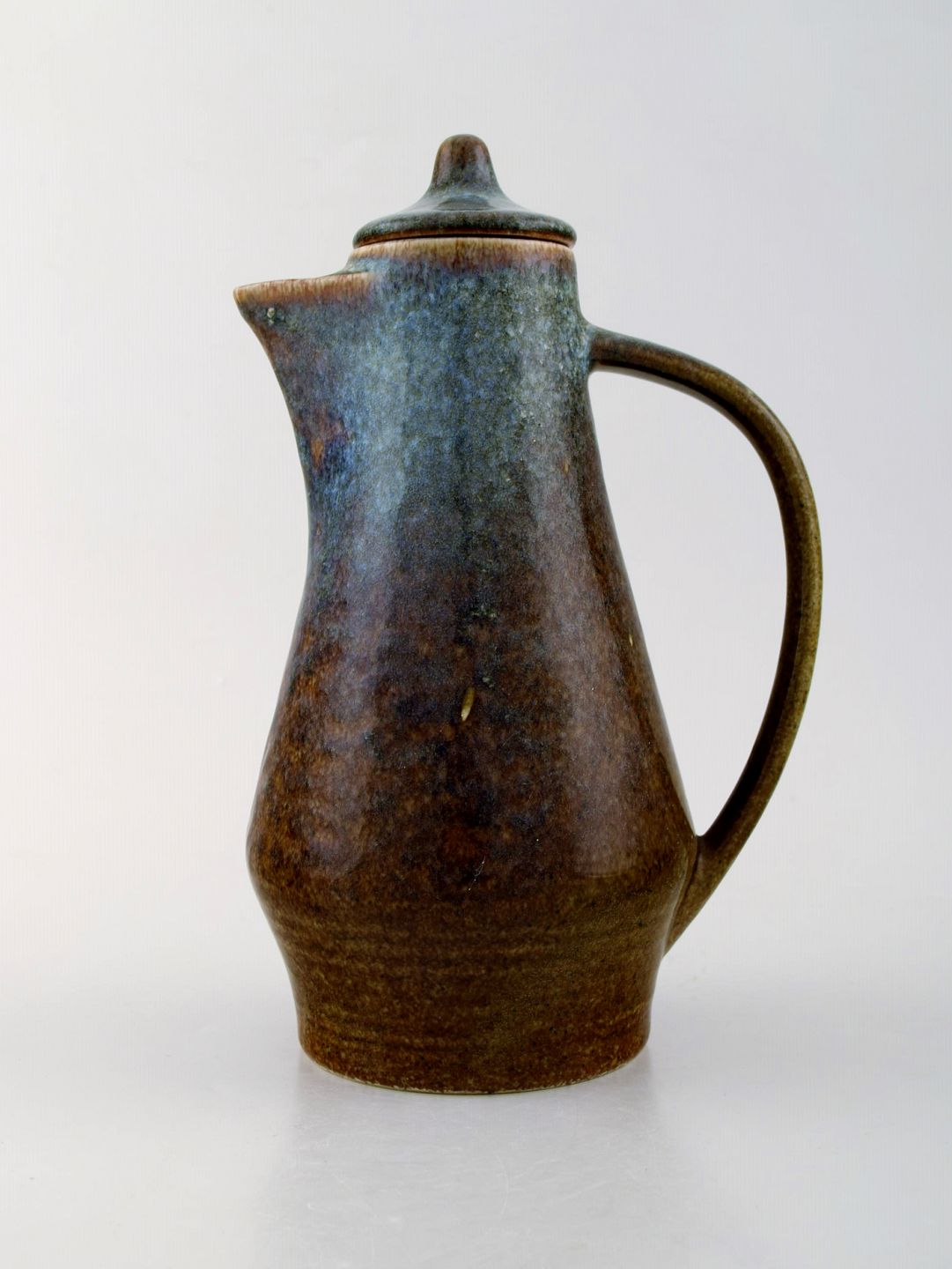 Carl Harry Stålhane for Rörstrand. Jug with lid in glazed stoneware.Beautiful glaze in blue and brown shades. 1950/60's.