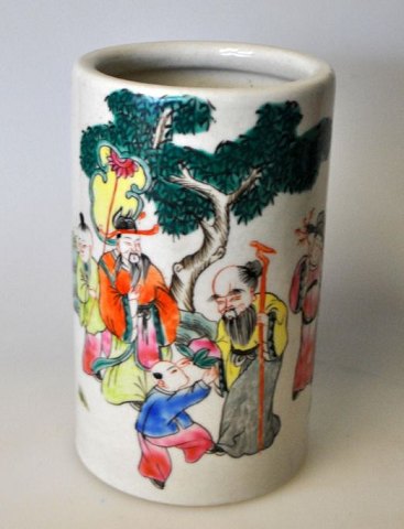 Kinesisk bemalet penselbæger i porcelæn, 20. årh. Dekoreret med vismænd. Polykrom dekoreret. Stemplet.: H. 13 cm.Emne nummer: 21305