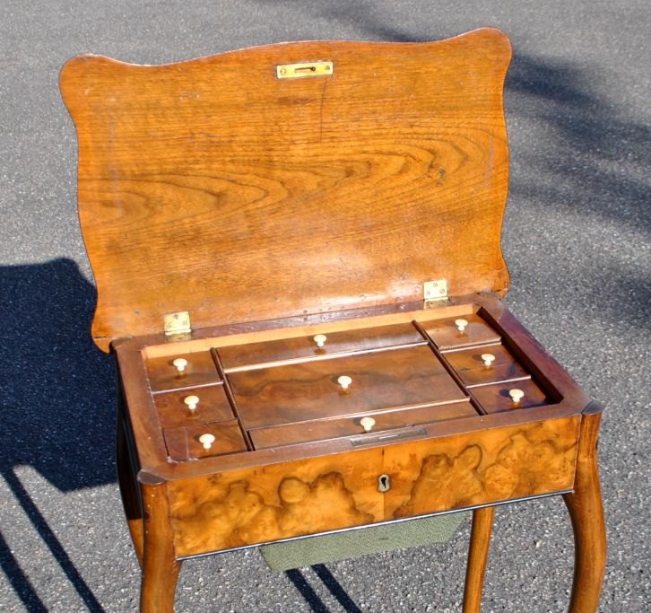 Ny rococo sybord i poleret valnød med intarsia, 19. årh. Danmark. Med capriole ben. Intarsia i form af blomster i en vase. Med opklappeligt låg, hvorunder er der 9 rum med låg. H.: 73 cm. B.: 35 cm. B.: 53 cm.Restaureret.