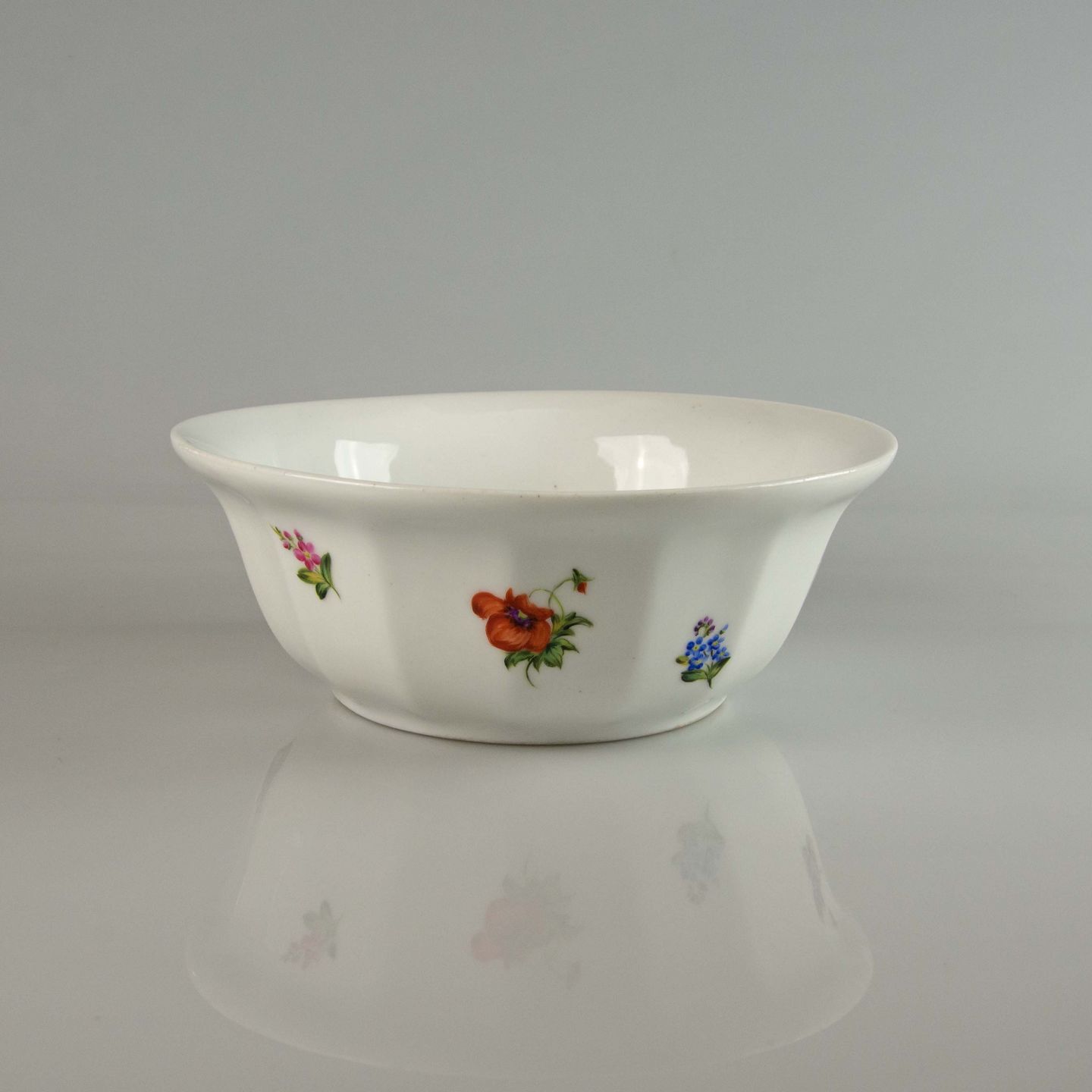Antik kantet skål i porcelæn med forskellige blomster motiver.Produceret af Bing og Grøndahl.