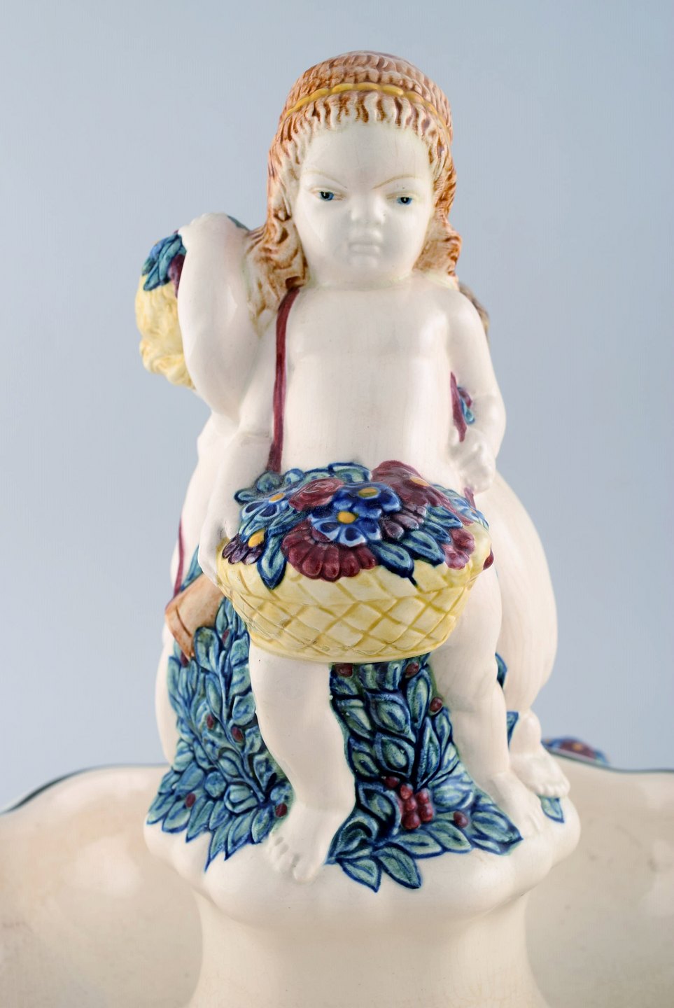 Wilhelm Süs (1861-1933) for Karlsruher Majolika. Large art nouveau compote in hand painted faience / majolica with playful children and flower decorations. Ca. 1910.Measures: 33 x 30 cm.