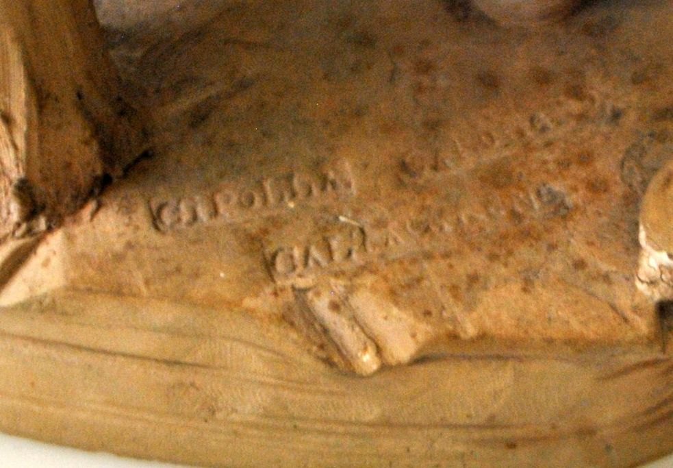 Italiensk figurgruppe i rødler, 19. årh. Stemplet: Cipolla Calogord og Messina. Unika. Figur af ung mand, kvinde og æsel. H.: 30 cm. L.: 27,5 cm.Proveniens: Nordby, Samsø.