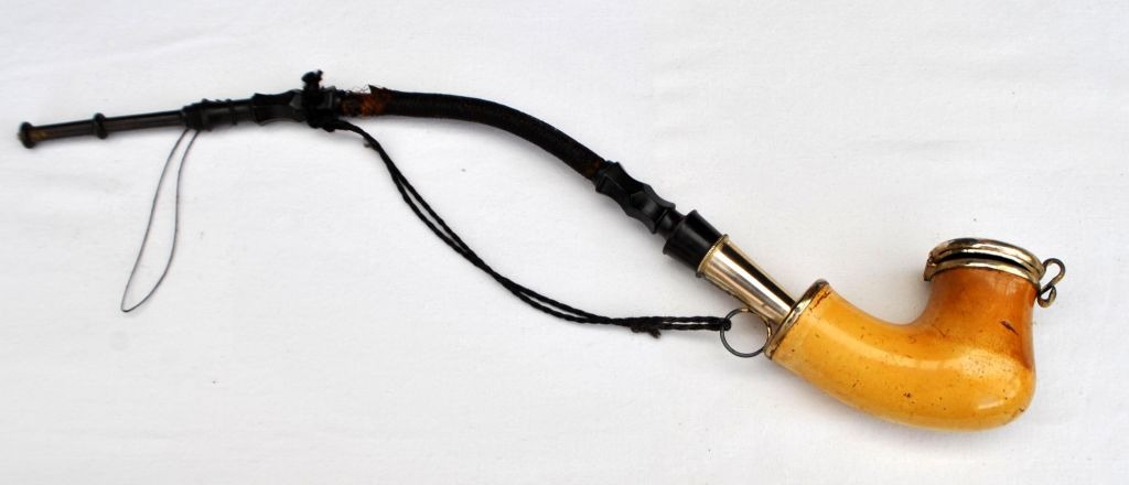 Lang pibe med merskum, 19. årh. Danmark. Forsølvet låg. L.: 44 cm. Højde pibehoved: 6,5 cm.Emne nummer: 21827
