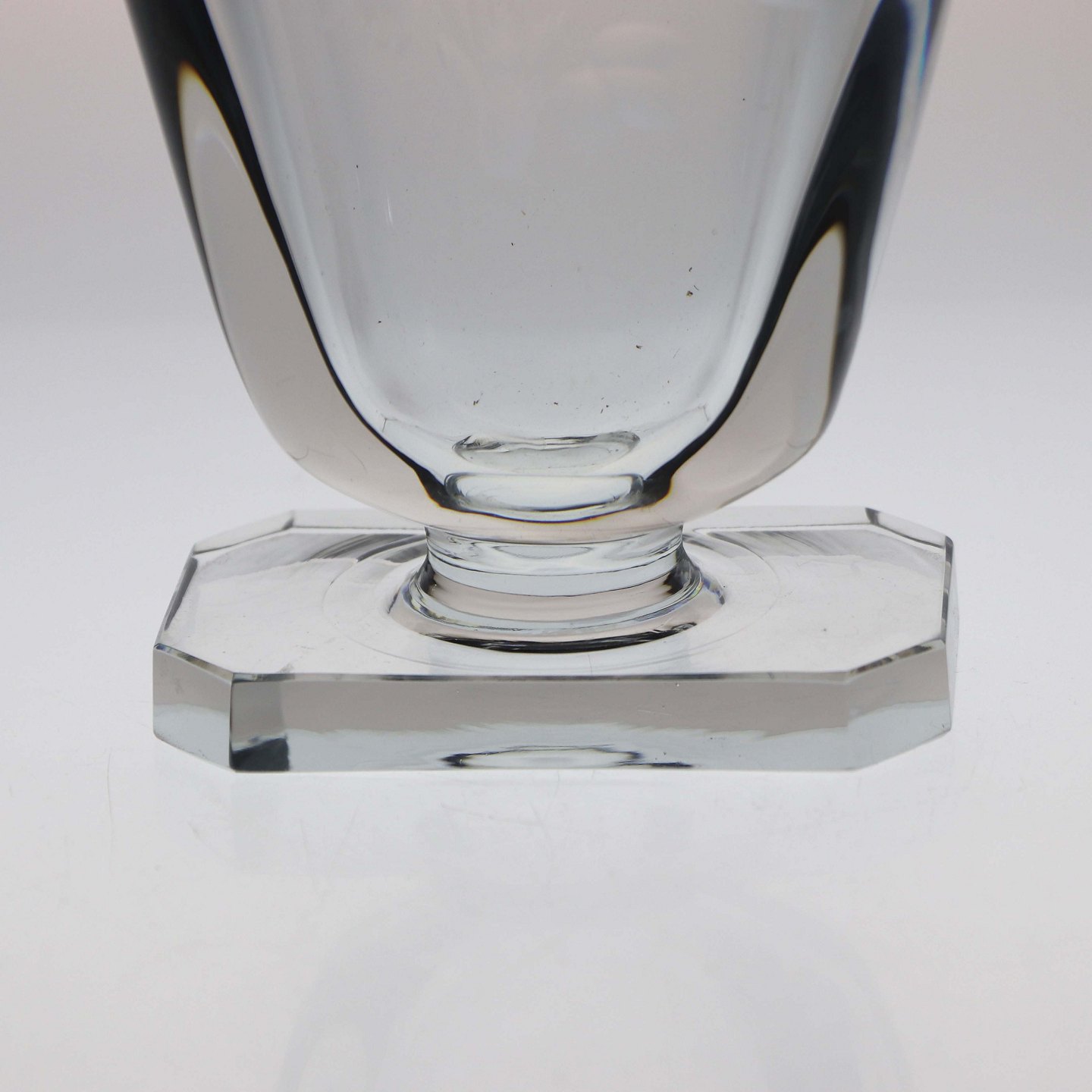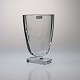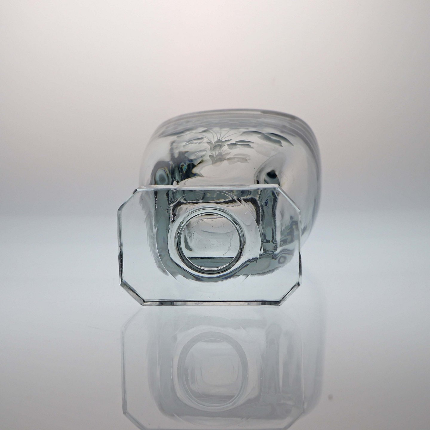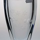 Vase i blålig glas på fod med motiv af blomsterbuket, hånd indgraveretProduceret af Strömberghyttan