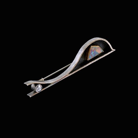 Ole Waldemar Jacobsen. Broche i sterling sølv og 14k guld med opal og diamant 0.15ct.Tegnet og udført Ole Waldemar Jacobsen - Copenhagen 1952 - 2002.