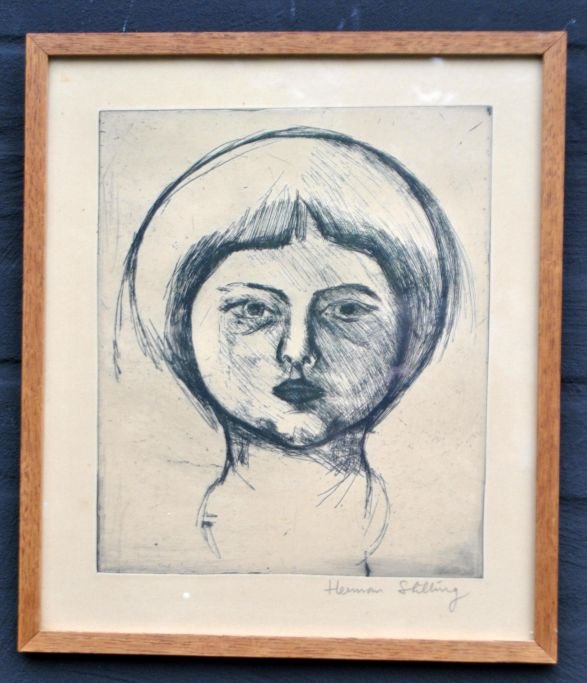 Stilling, Herman Emanuel (1925 - 1996) Danmark: Pige portræt. Radering. Signeret. 27 x 23 xm.Indrammet.