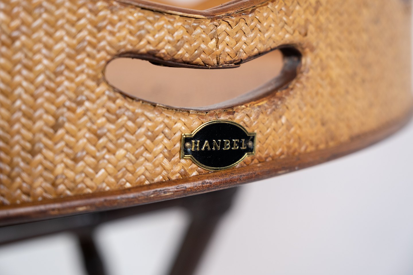 Bakkebord i poleret træ og flet fra 1970erne. Pladen kan tages af og stellet kan foldes sammen.H - 78 cm, B - 90 cm og D - 75 cm.
