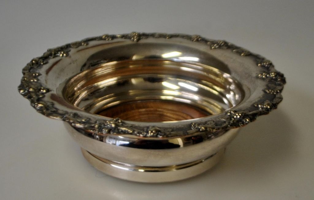 Silver-plated English bottle tray, 20th century. Bottom in mahogany wood. Edge decorated with vines and grapes. H .: 5 cm. Dia .: 16.2 cm.Item number: 22539
