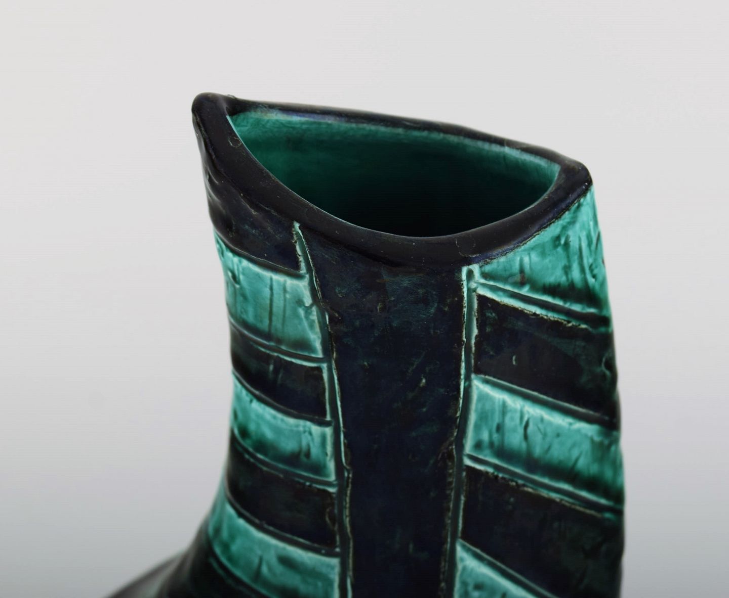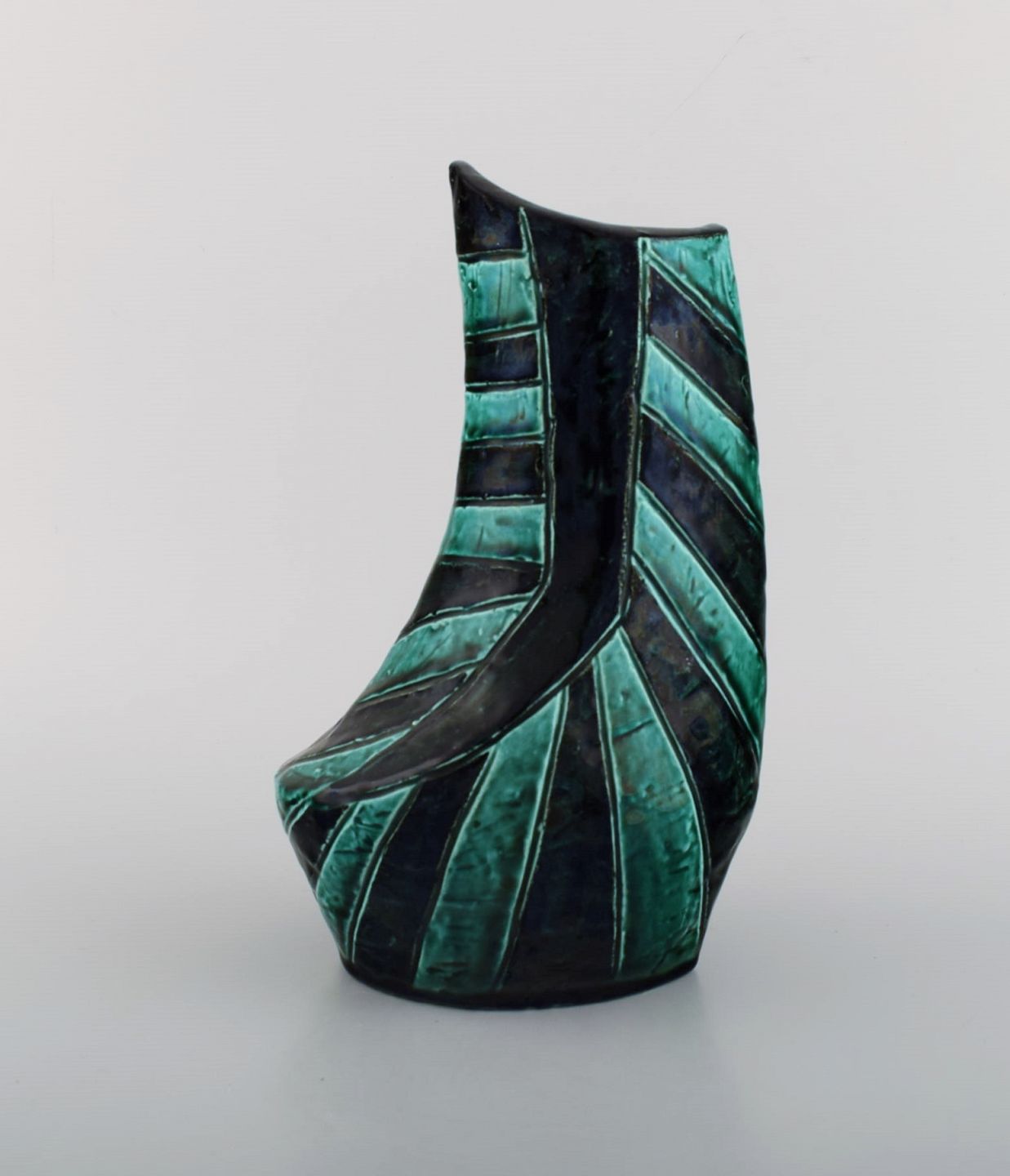 European studio ceramicist. Unique vase in glazed ceramics. Beautiful glaze in shades of blue and green. Striped design, 1960s / 70s.Measures: 23.5 x 14.5 cm.