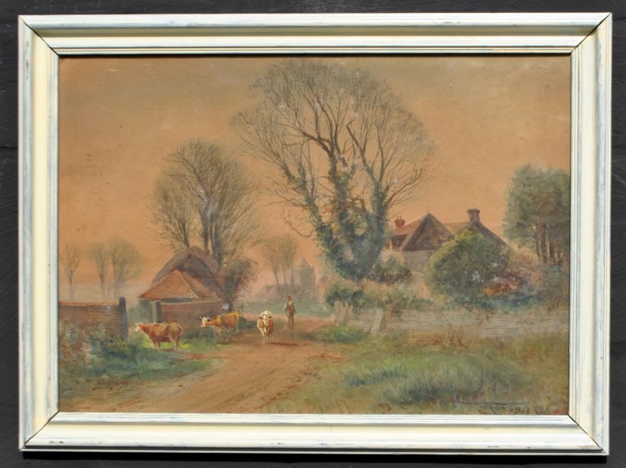 Fox, Henry Charles (1860 - 1929) England: En mand driver køerne hjem. Akvarel på papir. Signeret: H. C. Fox 1911 RBA,38 x 53 cm.Indrammet.