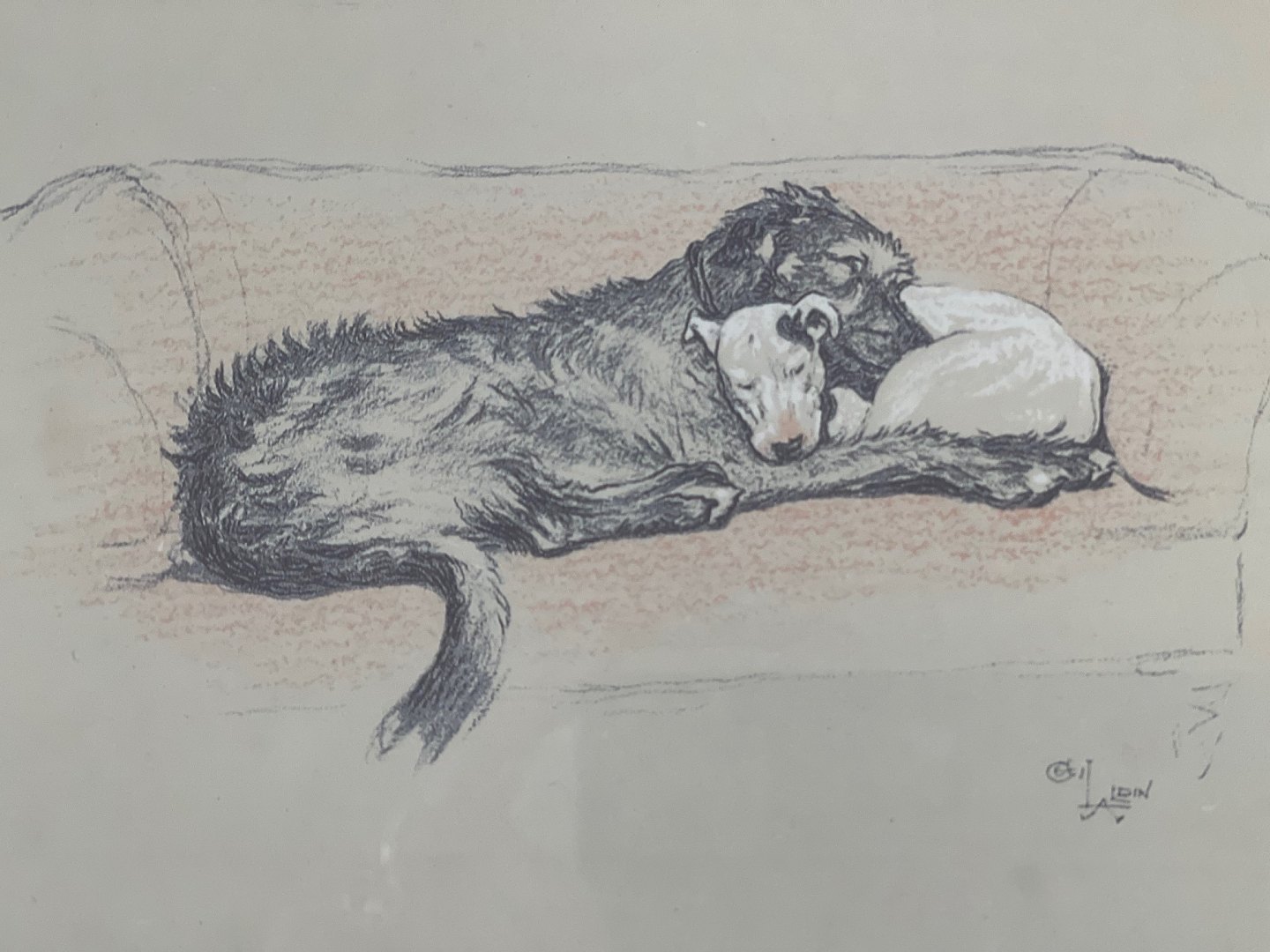 3 vintage prints (reproductions) with dogs by the English artist Cecil Aldrin (1870-1935). The prints are framed in beautiful frames of "fake" bird tree / root tree with gold edge and double mat. 20th Century.One print sold.