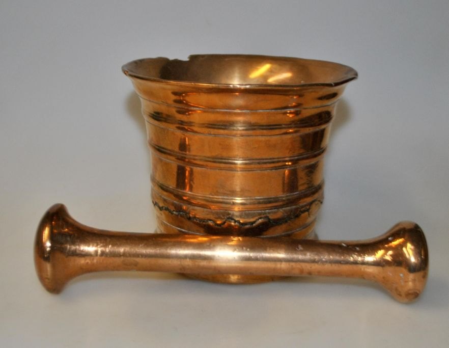 Apoteker messing morter fra Nibe Apotek med pistil, 18. årh. Danmark. Virkelig brugt eksemplar. H.,: 12 cm. Længde pistil: 21 cm. Emne nummer: 22752
