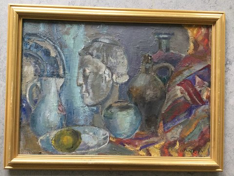 Erik Clemmensen (1905-84):Opstilling på bord med buste, kander og krukker mm.