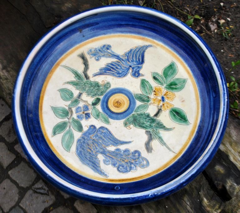 Danish potter (20th century): Large dish. Red clay, with green, blue and yellow glazes. Decorated with pigeons and parrots. H: 6 cm. Dia .. 34.5 cm.Flawless!