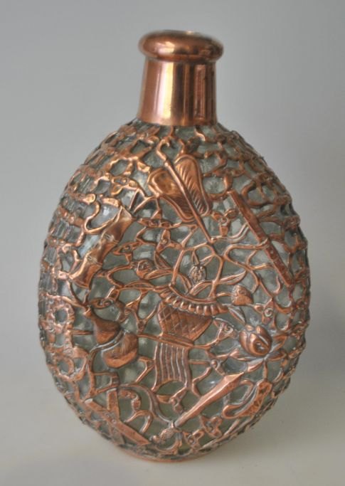 Antik whiskey flaske med kobber dekoration, 19./20. årh. Orientalsk arbejde. Hele flasken er dekoreret med mønstre og figur kompositioner, bla.a. kurv med blomster, sværd m.v. Højde.: 22 cm.Indvendig er flasken gået i stykker i toppen.