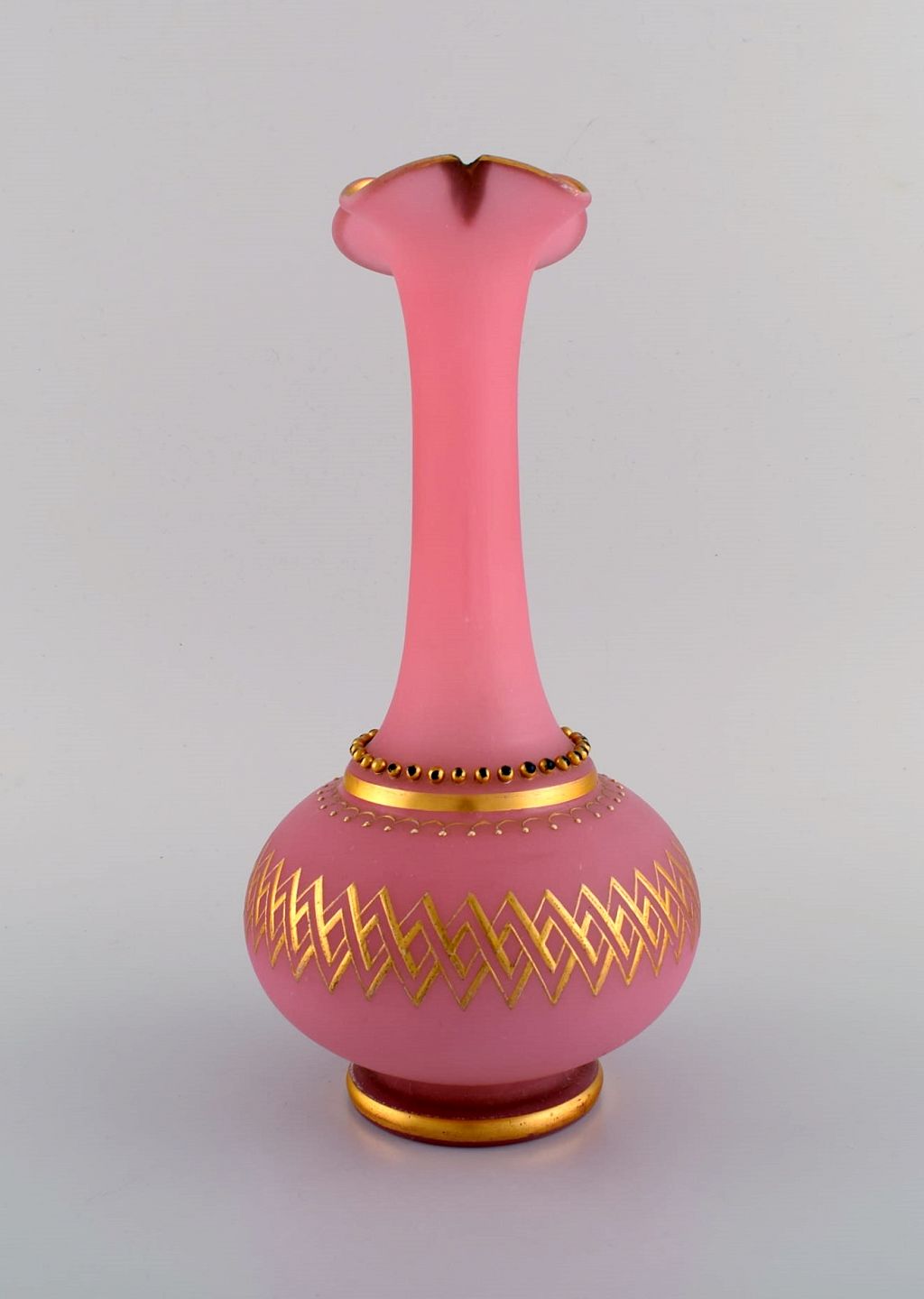 Large vase in pink mouth-blown art glass decorated with 24 carat gold leaf. Italy, ca 1900.Measures: 28 x 14 cm.