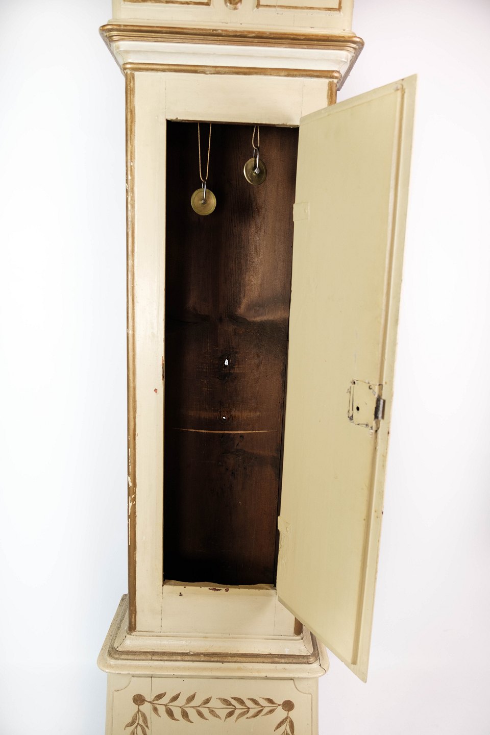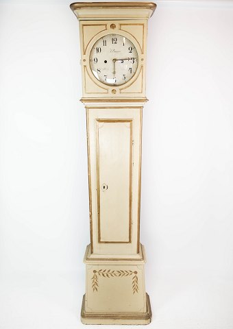 Bornholmerur af hvid malet træ og dekoreret med guld, i flot antik stand fra 1820erne.H - 203 cm, B - 60 cm og D - 24 cm.