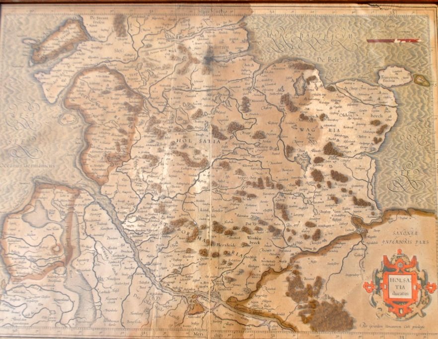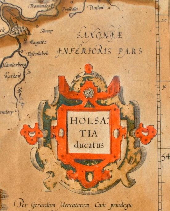 Mercator, Gerardus (1512 - 1594) Tyskland/Flandern: Kort over Holsten. Håndkoloreret kobberstik. Signeret i trykket. 35 x 48 cm. NB: Indrammet. Med fugtpletter. Fra værket Atlas 1595. Fransk udgave.Emne nummer: 23093