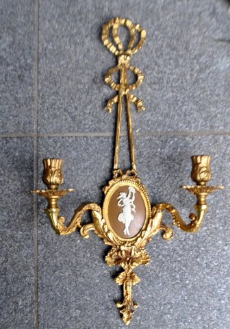 French wall applique in gilded bronze, Louis XVI style, 19th century. With plaquette of dancing girl in bisquit porcelain. Height: 46.5 cm. W .: 26 cm.Item number: 23309