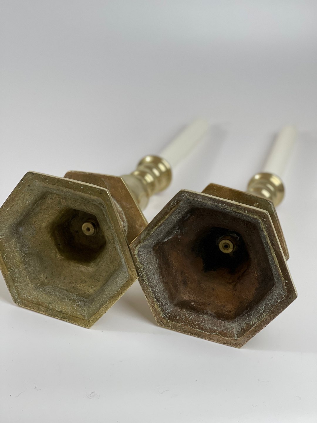 Par barokstager (kopier) fra 1900-tallet. Sekskantede med engle. Stagerne vejer næsten 2 kilo stykket og er udført i massiv messing (ca. 1950 gram og 2000 gram).Højde: 23,50 centimeter.