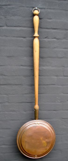 Heating basin in copper, 19th century Denmark. Bassin with lid. Unstamped. Dia .: 30 cm. H .: 9 cm. Length of handle in oak: 80 cm.Item number: 23322
