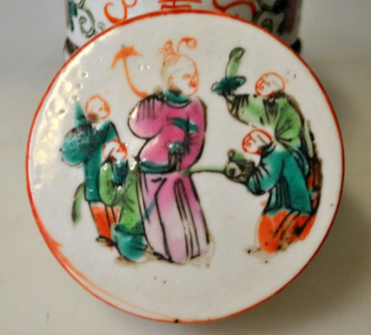 Kinesisk mad container i porcelæn, 19. årh. Famille rose. Sider dekoreret med tegn, sommerfugle og grøntsager. Låg dekoreret med 5 personer. Bestående af 4 beholdere. Højde.: 11,5 cm. Dia.: 9 cm.Indvendig med hår revne og mindre kant hak.