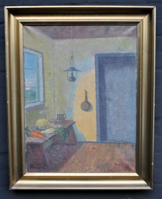 Dansk kunstner (20. årh.): Køkken interiør. Olie på lærred. Utydelig signeret. 60 x 46 cm.Indrammet.