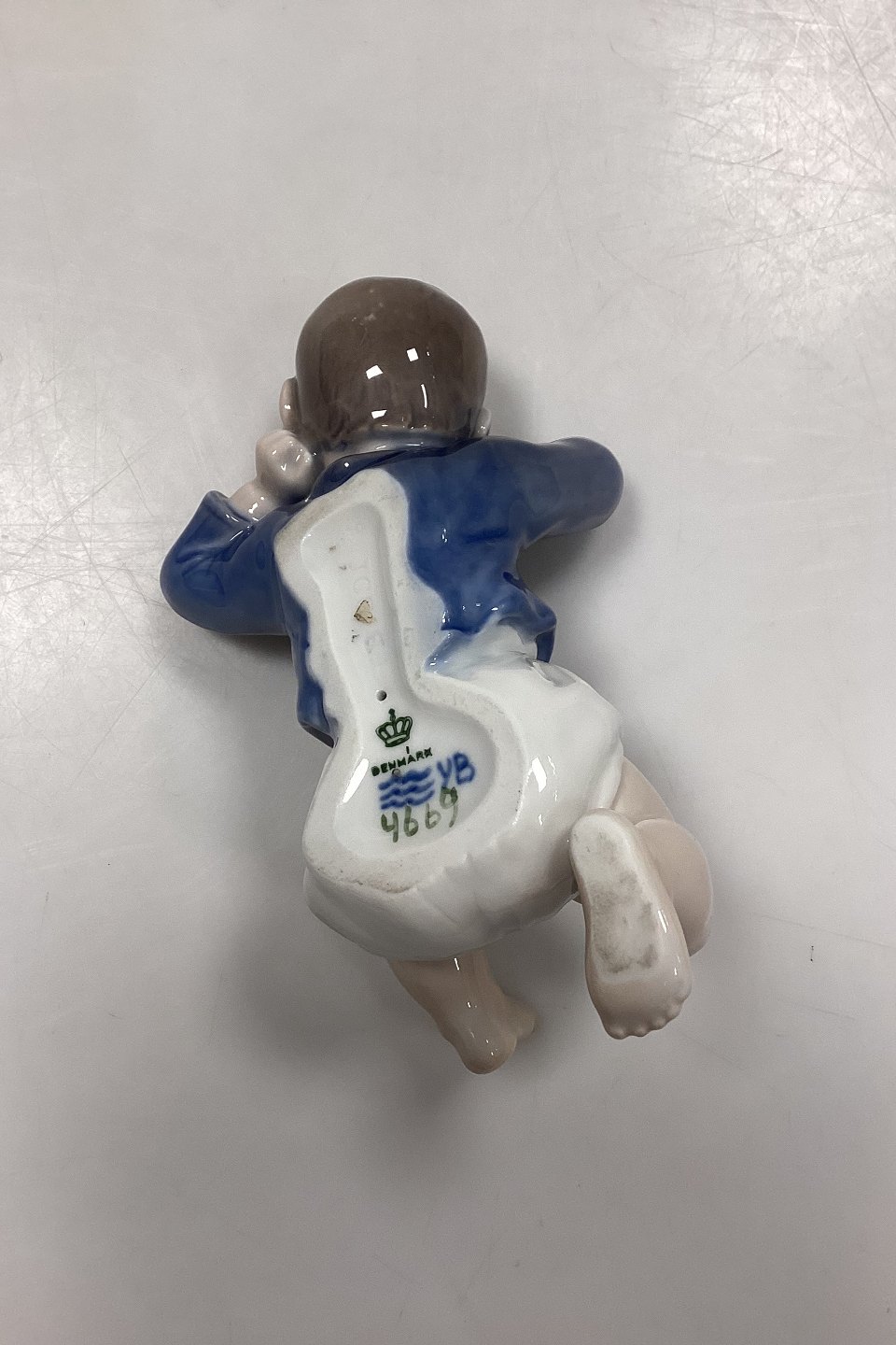 Royal Copenhagen Figur Liggende Barn No. 4669. Designet af John Galster. Måler 8 cm x 14 cm / 3,14 in. x 5,51 in. 2. SorteringLager: 1
