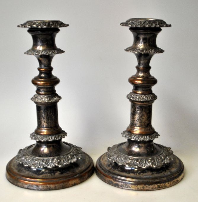A pair of antique English telescopic candlesticks, 19th century silver-plated copper. Decorated with foliage. H .: 20.5 cm. Extracted: 28 cm.appears unpolished.