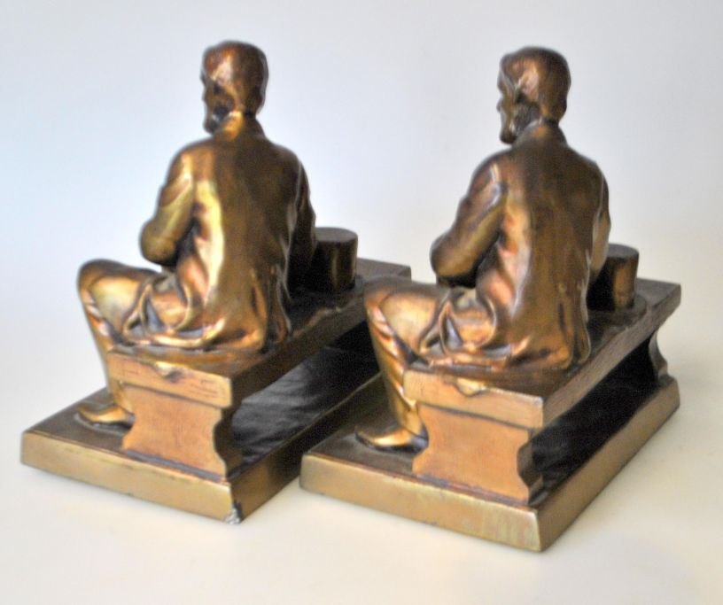 Ronson bookends in patinated metal, approx. 1900, USA. Bookends depicting President Abraham Lincoln (1808 - assassinated 1865) sitting on a bench. Completed. 15.2 x 17 x 9.5 cm. On the bottom label from Ronson. Weight per pcs: 2,049 grams.Lincoln was the 16th president of the United States.