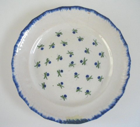 Fajancetallerken, Frankrig, 19. årh. Grådekoreret, med fliget fane med blådekoreret kant. Fane med blå og grøndekorerede bær. Dia.: 23,5 cm. Restaureret.Emne nummer: 2695