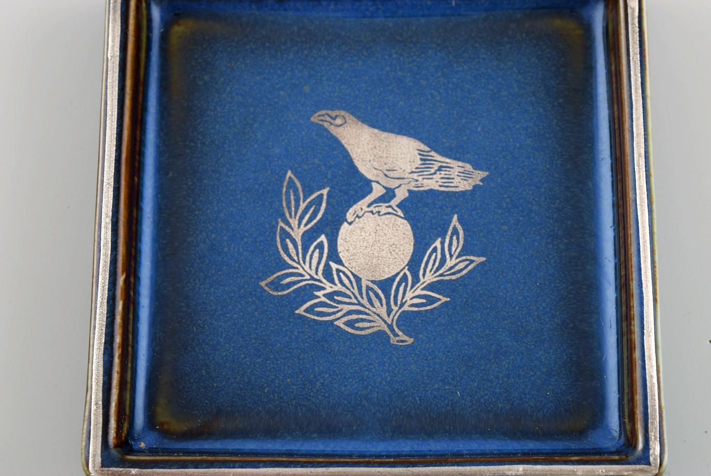 Sven Jonson (1919-1989) Gustavsberg. Tre små Lagun fade i glaseret stentøj med sølvindlæg. Smuk glasur i blå nuancer. 1970'erne.Måler: 9 x 9 x 1,5 cm.