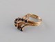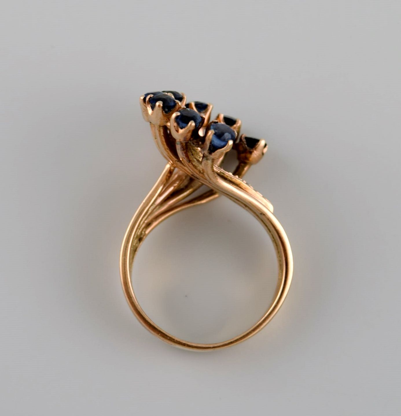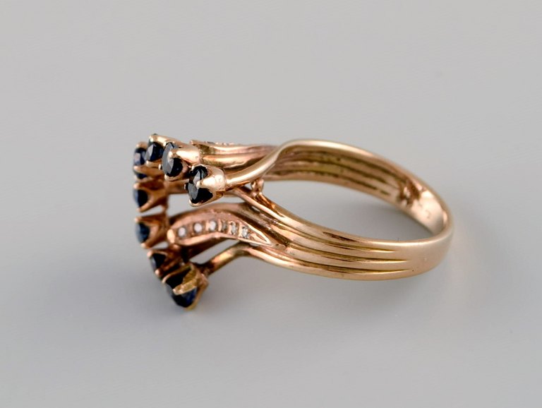 Swedish jeweler. Large vintage ring in 14 carat gold adorned with faceted sapphires and diamonds. 1930s.Diameter: 16 mm.