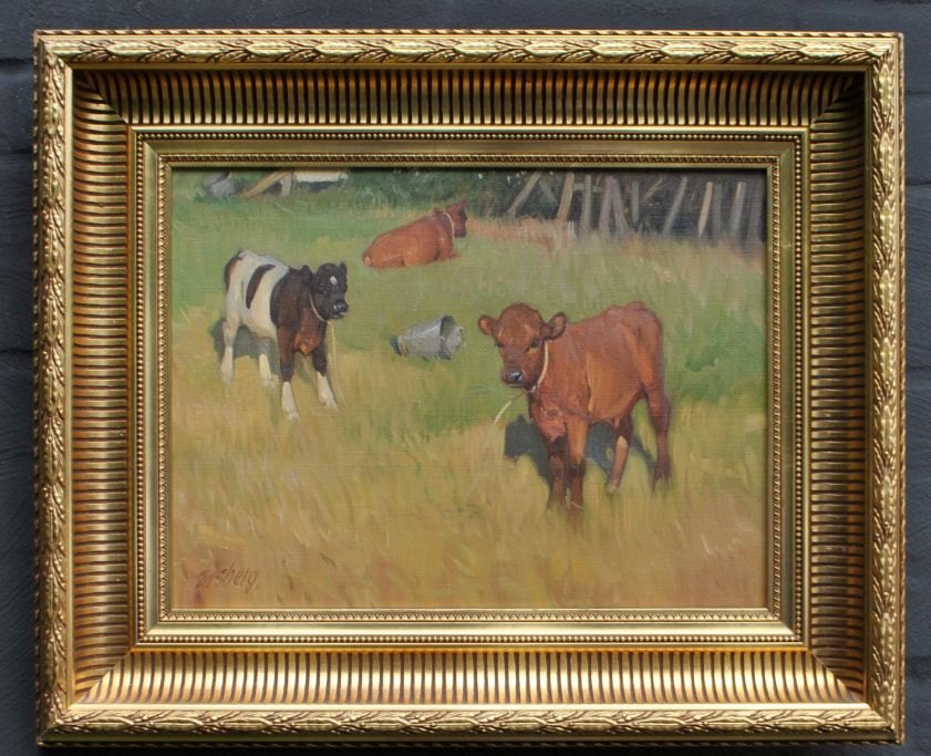 Edsberg, Knud (1911 - 2003) Danmark: Kalve på en mark. Olie på lærred. Signeret. 30 x 40 cm.Indrammet: 48 x 58 cm.