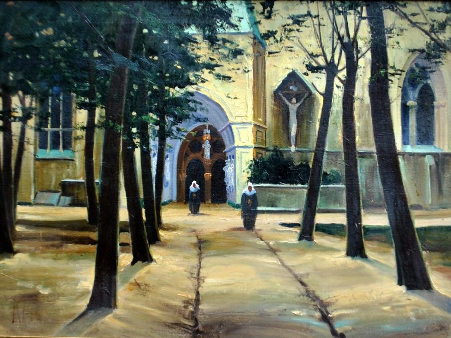Svendsberg, Knud Petersen (1889 - 1976) Danmark: To nonner på vej ud af en kirke. Olie på lærred. Signeret. 48 x 56 cm.Indrammet. 53 x 64 cm.
