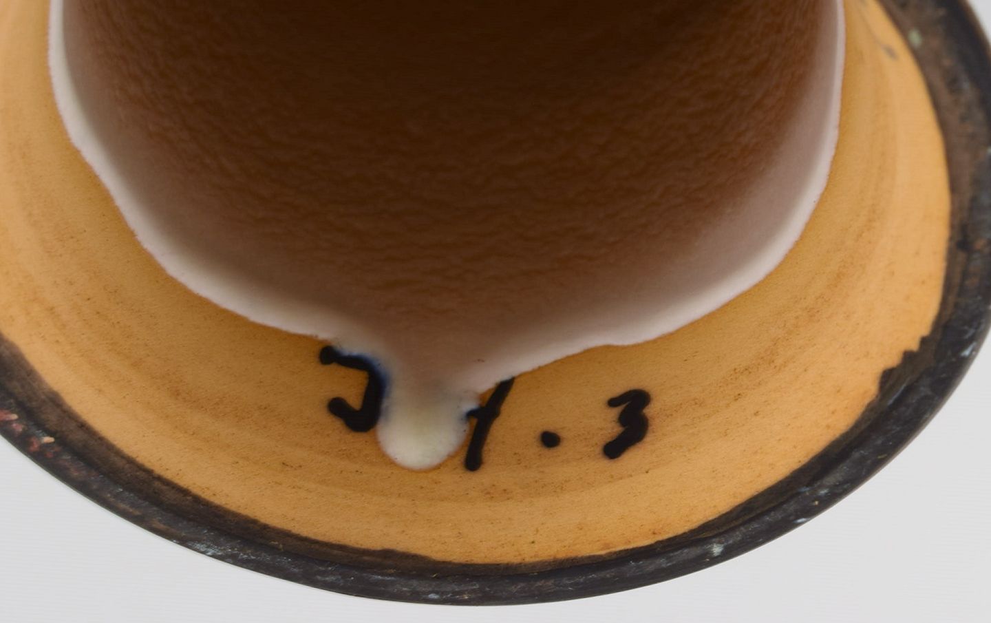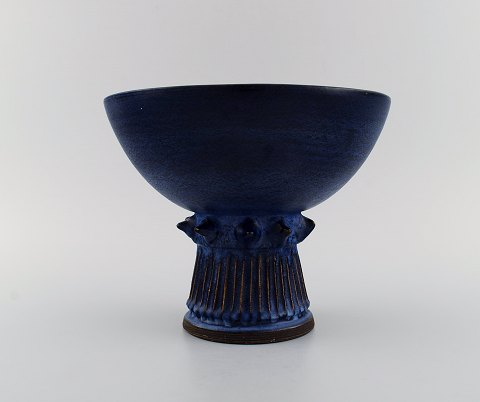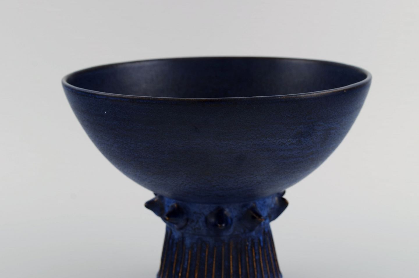 Irma Yourstone (1911-1988), Sverige. Skål på fod i glaseret stentøj. Smuk glasur i dybe blå nuancer. 1960'erne.Måler: 22 x 18 cm.