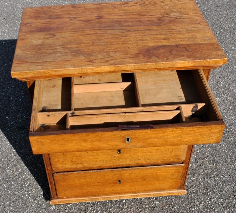 Poleret egetræs kommode, 20. årh. Danmark. Ombygget ældre kommode fra det 19. årh. Med fire skuffer. Øverste skuffe med mindre rum. H.: 73 cm. B.: 61 cm. D.: 37 cm. Med gamle låse.Emne nummer: 24699