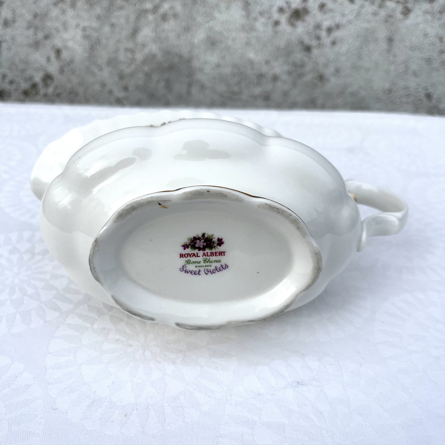 Royal Albert, Bone China, Sweet violets, Field violet, Sauce jug, 20cm long, 9cm wide, 9cm high *Perfect condition*Stock: 1