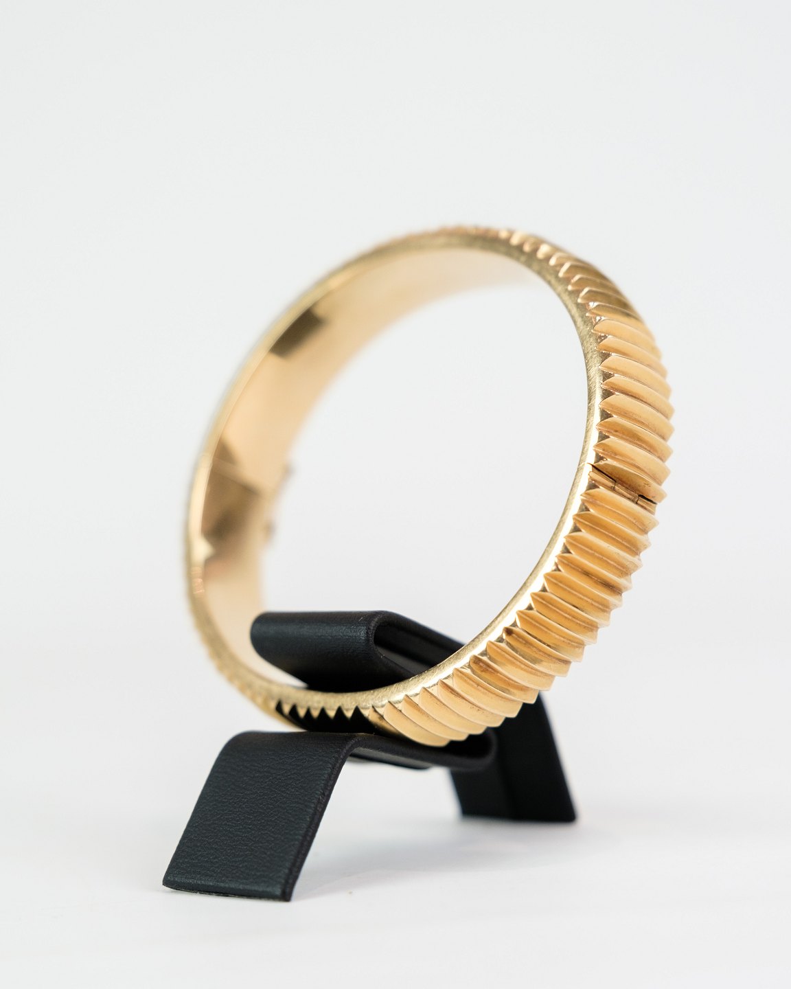 Bangle with grooved surface stamped 750, 18 carat gold with 3 paws. Unique Swedish jewellery.Dia: 6 W: 1.5 - 30 grams