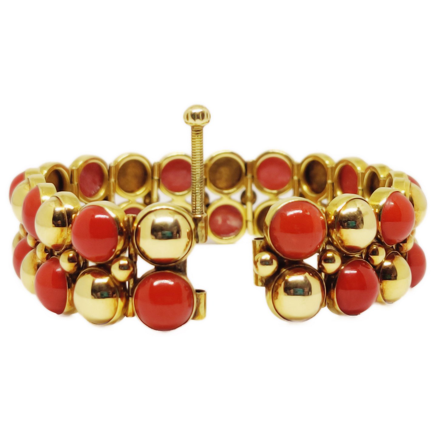 Karl Gustav Hansen for Hans Hansen; Armbånd i 14 guld med koraller #458. Runde led med skiftevis guld- og koral halvkugler.Stemplet "Hans Hansen 585 HaH 458". L. 18,5 cm. B. 19 mm.