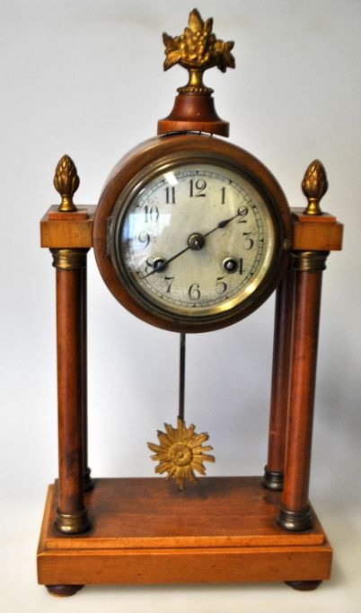 Søjleur i træ med bronzer, 20. årh. Tyskland. H.: 33 cm.Forsølvet skive med arabertal. Pendul i bronze.Emne nummer: 24715