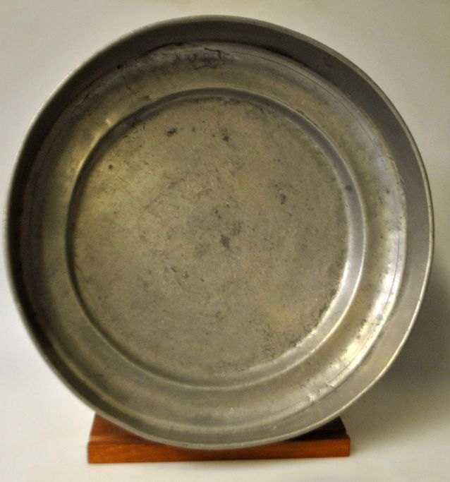 Large pewter dish on base, 18th century. Indistinctly stamped. Engraved: M. Height: 6 cm. Dia.: 29.5 cm.With repair.