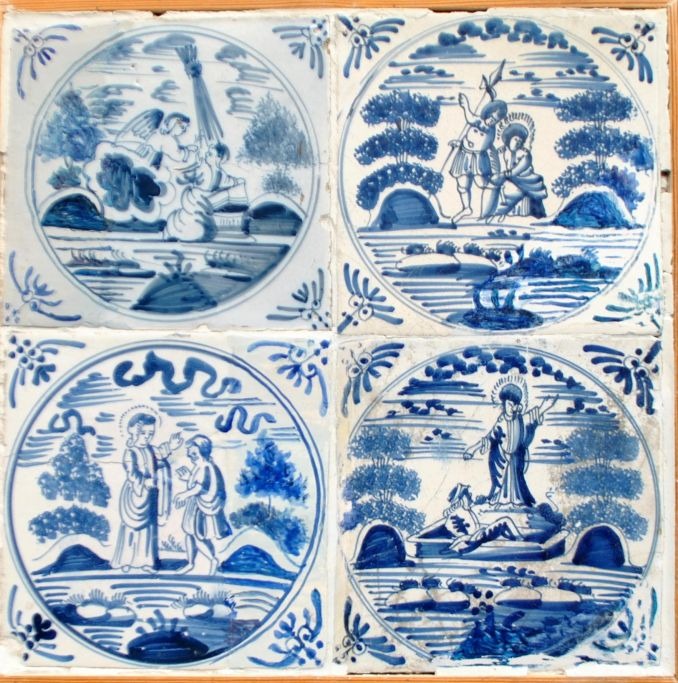 Flise firpas, blådekorerede fliser med religiøse motiver, 18. årh. Holland. Med hjørnedekorationer i form af oksehoved. 13 x 13 cm.Indrammet 28 x 28 cm.