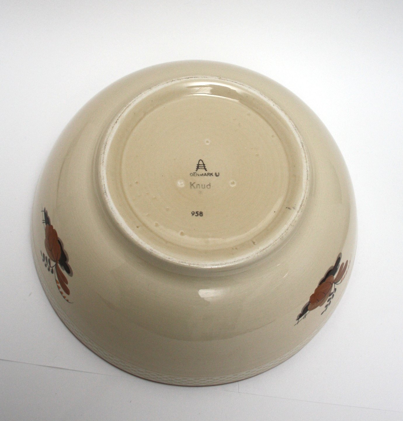 Aluminia fajance. Knud. Design Niels Thorsson. Håndmalet. Produceret i perioden 1934-1963. Stor salatskål. Nr. 958. Højde 10,5 cm. Diameter 26 cm. Flot stand. Pris: 450 kr. stk. Lager: 1