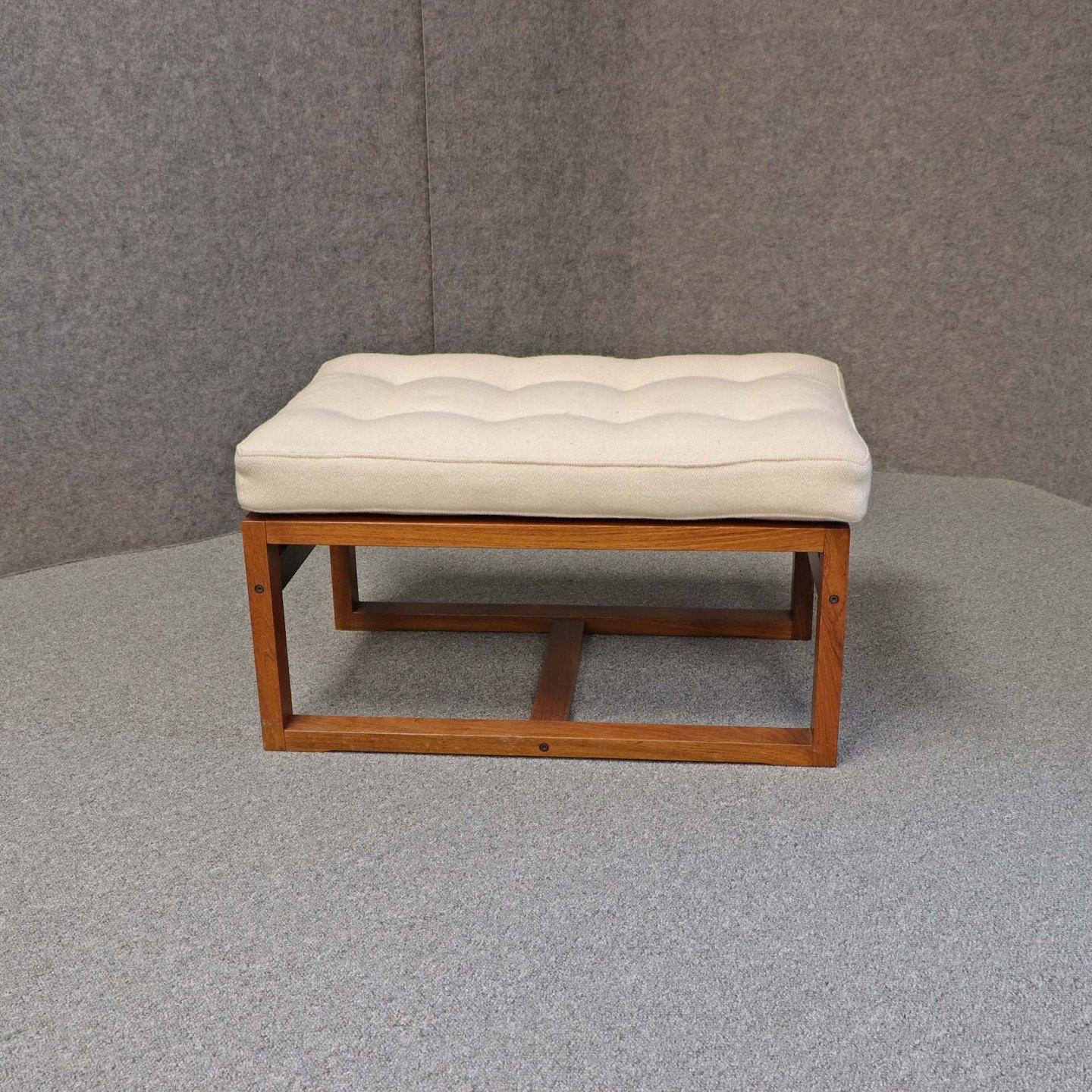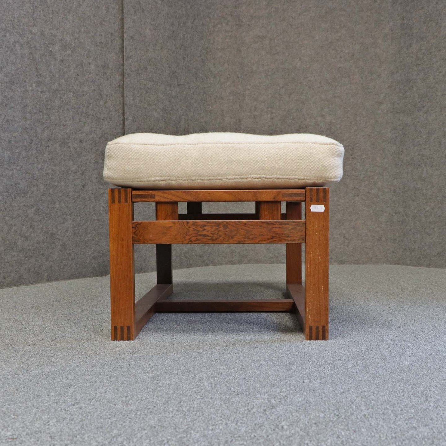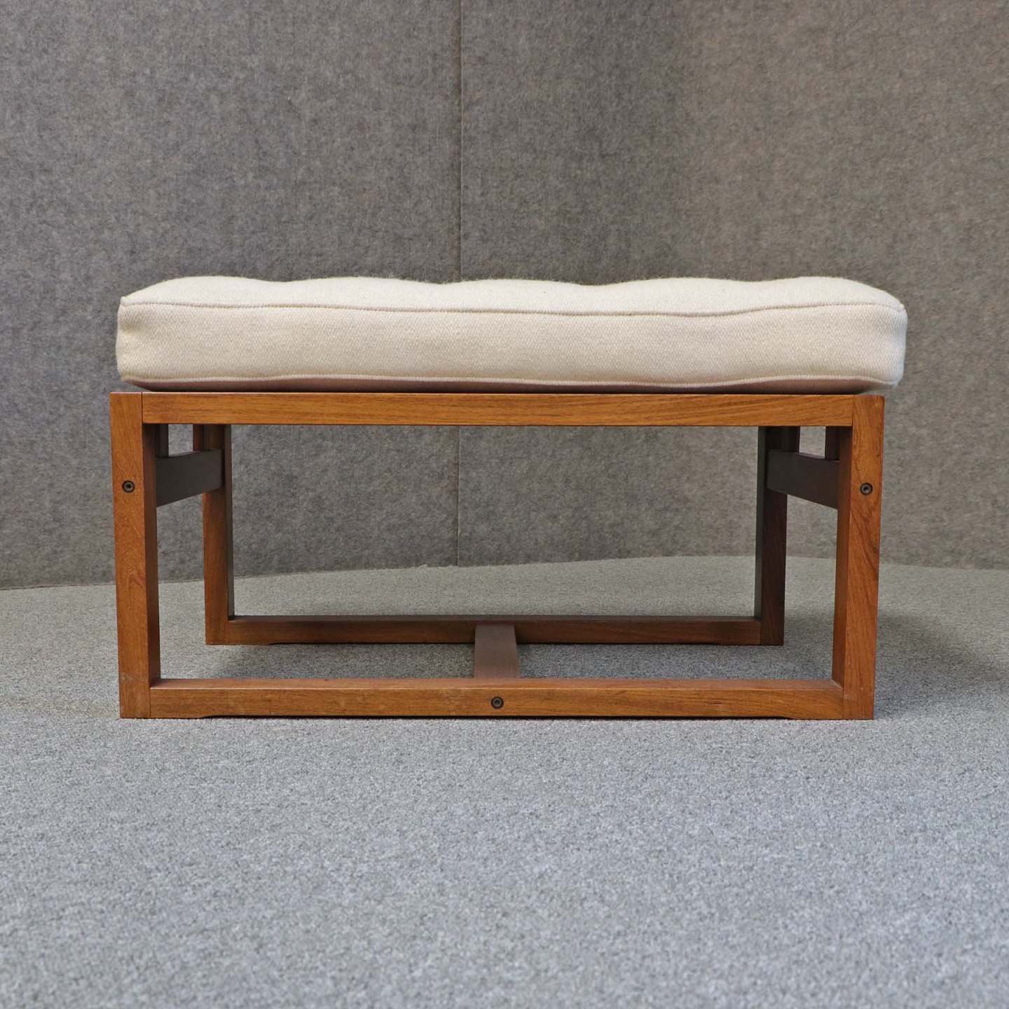 Skammel stel i teak med polstret hynde med rådhvid uldbetrækDansk design