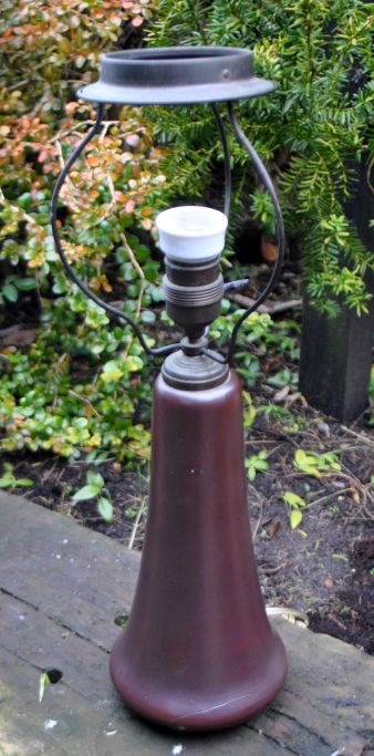 Bordlampe i keramik, L. Hjort, ca. 1910 - 1920, Bornholm, Danmark. Brunglaseret. Jugend. Stemplet. Højde med elmontering: 48 cm.Emne nummer: 25178