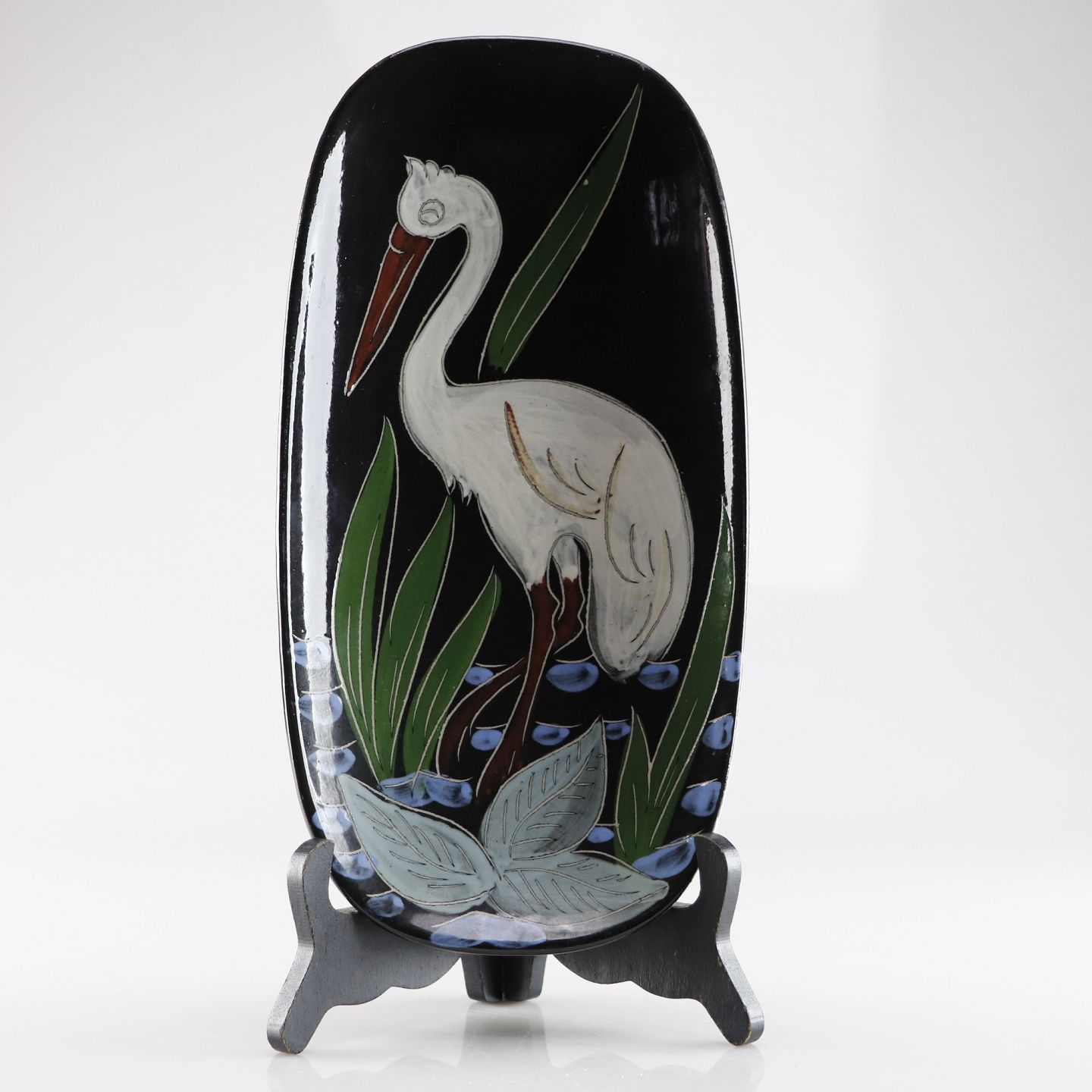 Glaseret platte i keramik med motiv af storkProducent Arnold Wiigs fabrikker, Halden, Norge