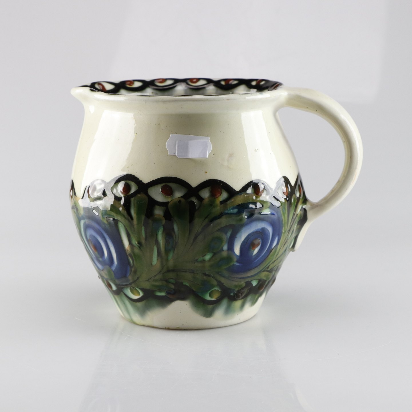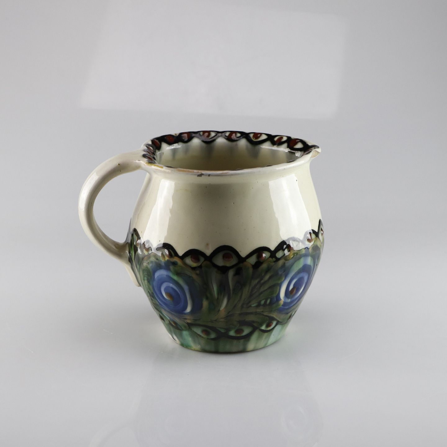 Keramikkande med hank dekoreret med påfuglefjer og blå ringeDesign Kähler